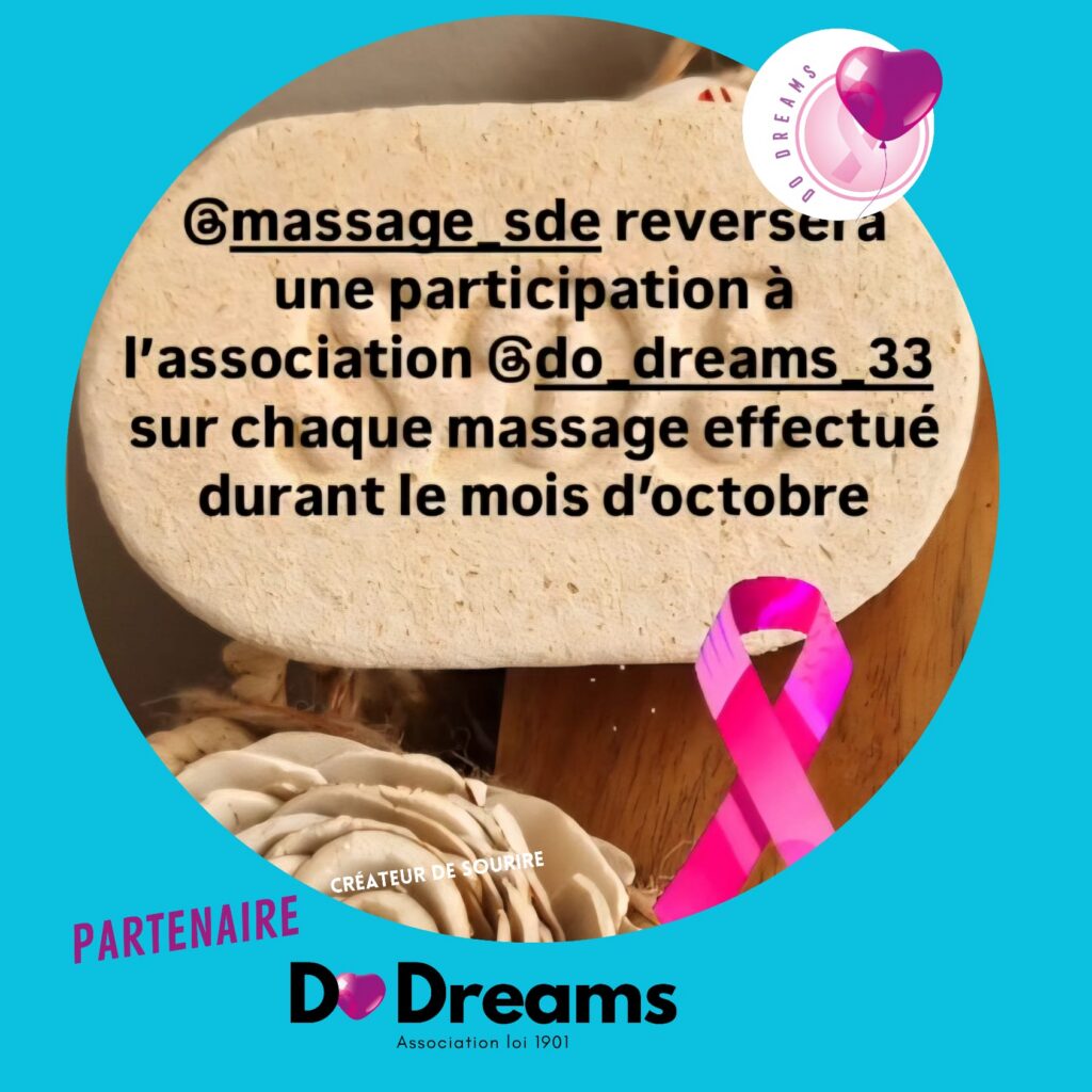 C’est le moment de joindre l’utile à l’agréable ! Tout au long du mois d’octobre, en soutien à Octobre Rose, 5€ de chaque massage réalisé chez Symphonie d’Essence à Saint-André-de-Cubzac seront reversés à l’association @do_dreams_33 pour aider les personnes atteintes de cancer.